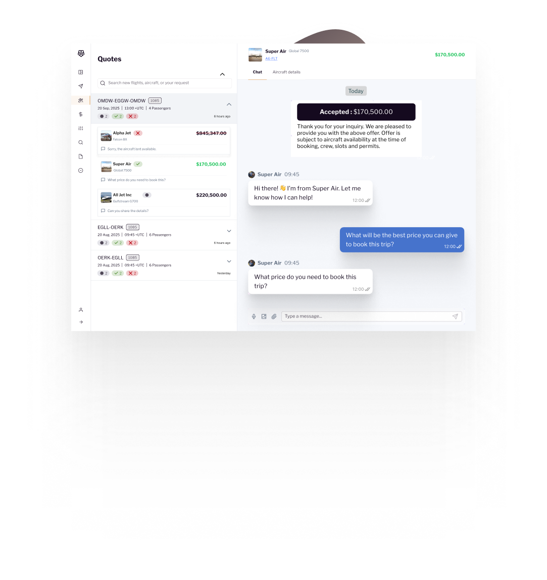 From contracts to aircraft photos, share everything directly in chat. With live updates on status and pricing, brokers and operators stay on the same page and move deals forward faster.