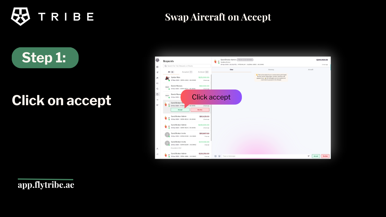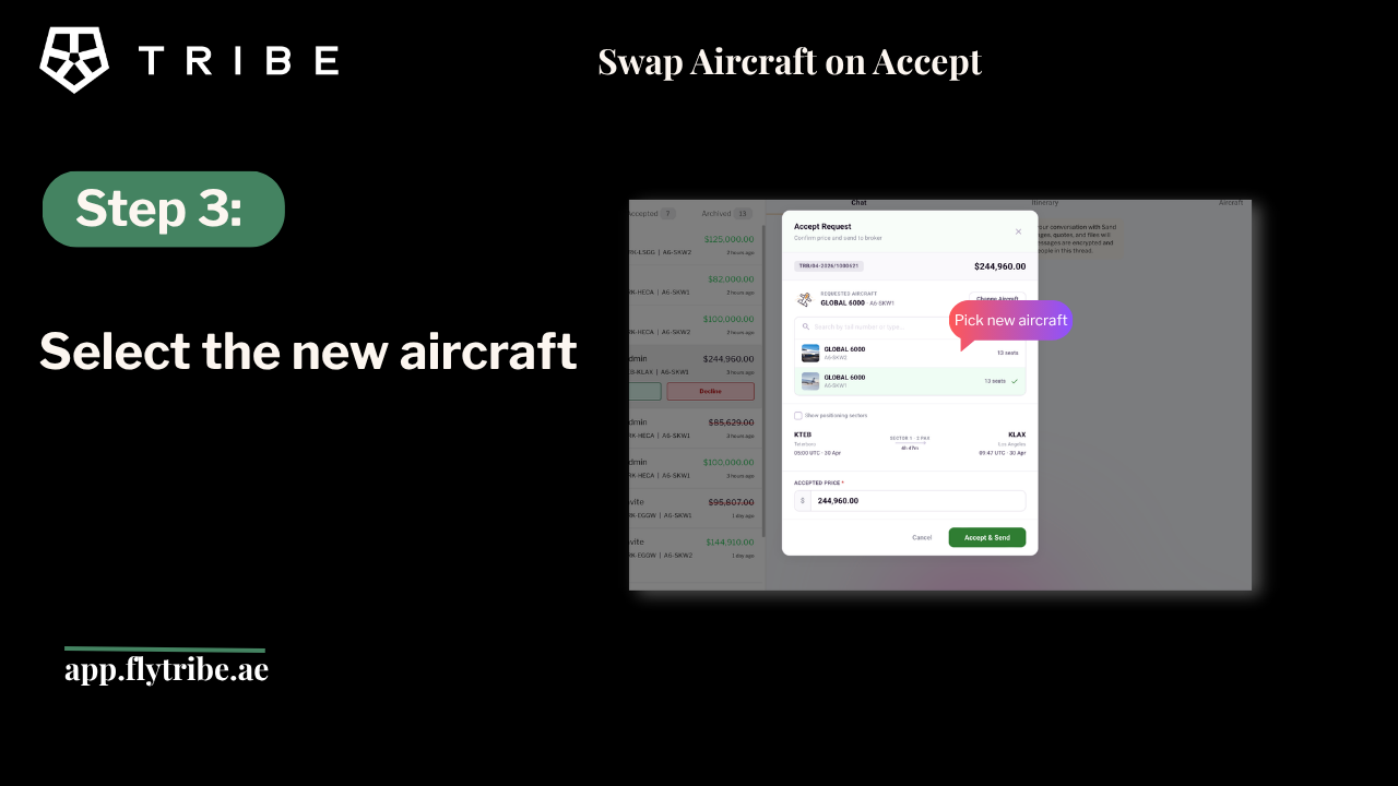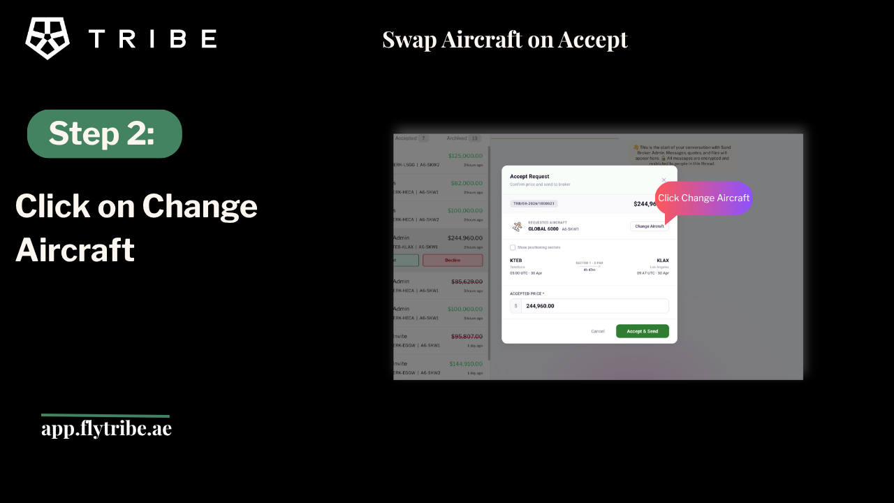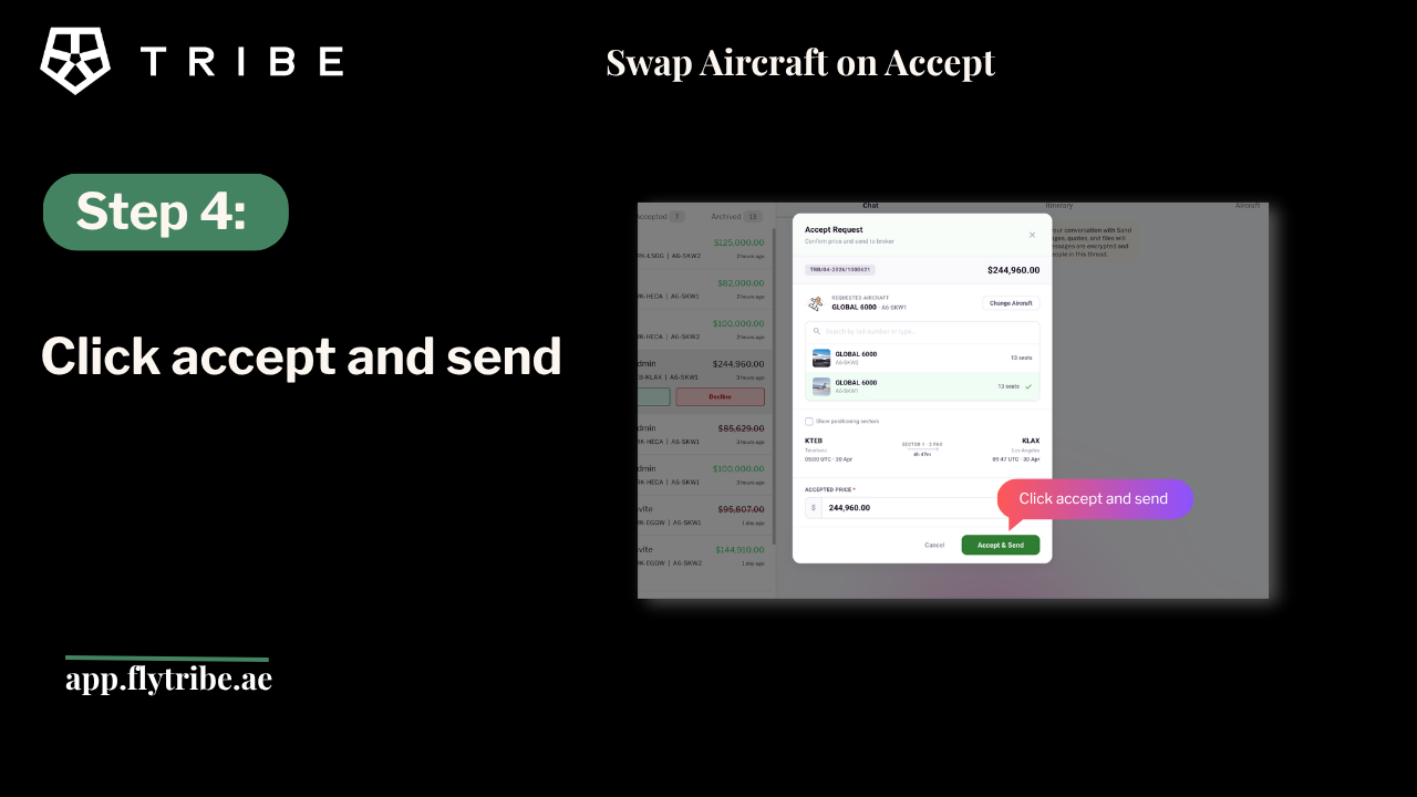 Once you're happy with the aircraft and price, click **Accept & Send**. Tribe handles the rest.